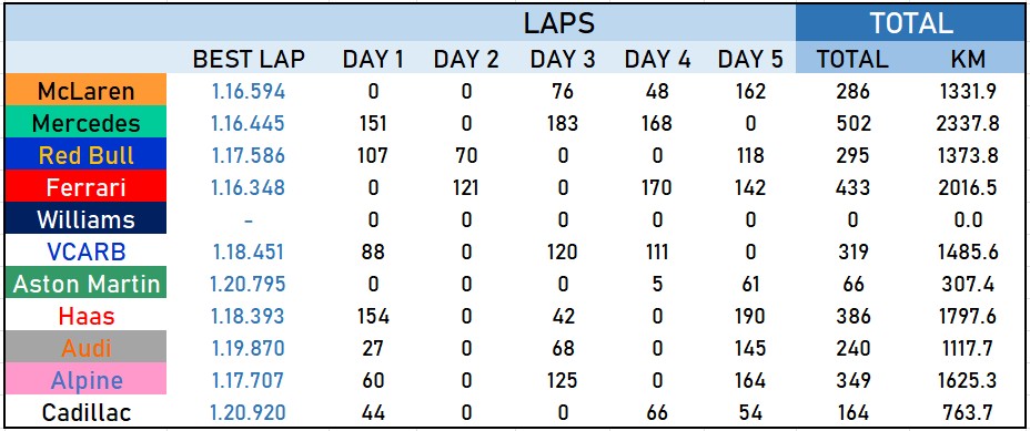 Oltre 500 giri, 300km in più di Ferrari e una marea rispetto agli altri, i tempi arrivavano facile e Russell ha fatto segnare il suo crono un giorno prima degli altri, con una pista più fredda e meno gommata.