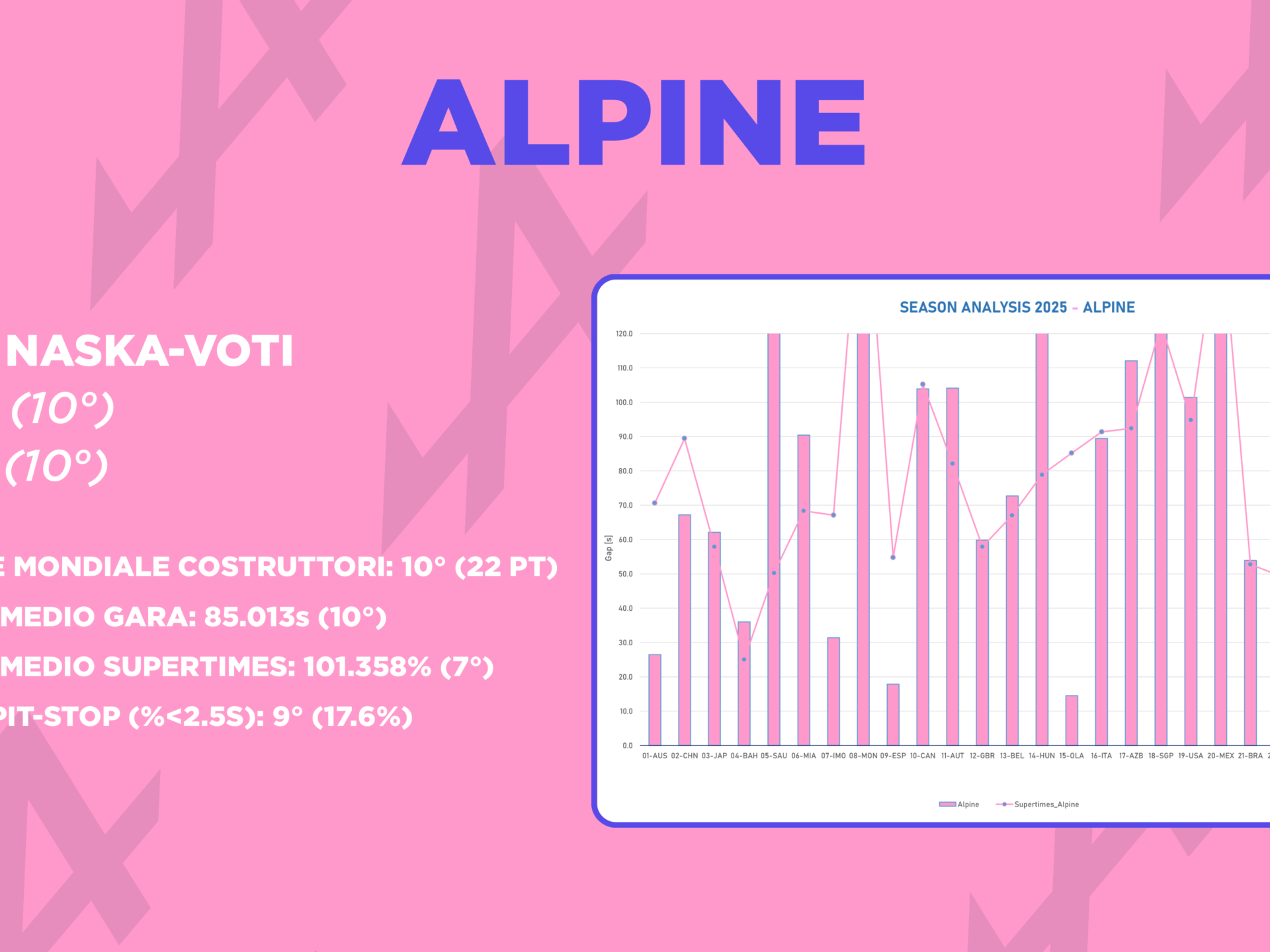 Sono stati bravi a raccogliere tanti punti rispetto al potenziale, dato che sono 7° nella media Supertimes e anche in classifica Costruttori; per il resto, una monoposto troppo in sofferenza nel veloce e con troppo drag.