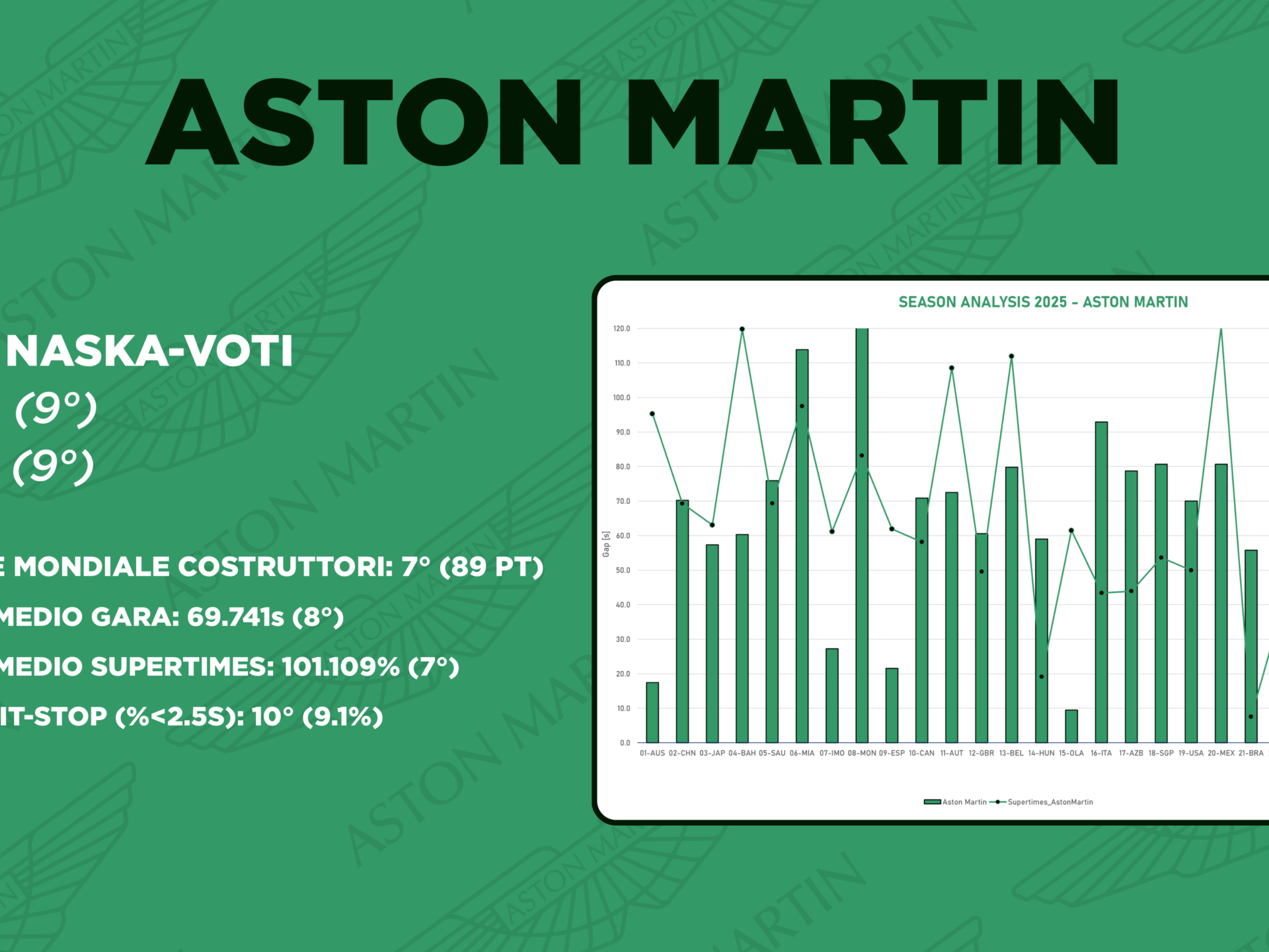 Tremendo il dato dei pit-stop, con l’ultima posizione nel ranking e nemmeno il 10% delle soste sotto i 2.5s. Quindi, una stagione deludente rispetto alle attese e alla disponibilità di una squadra come l’Aston Martin, che nel 2023 arrivava spesso sul podio.