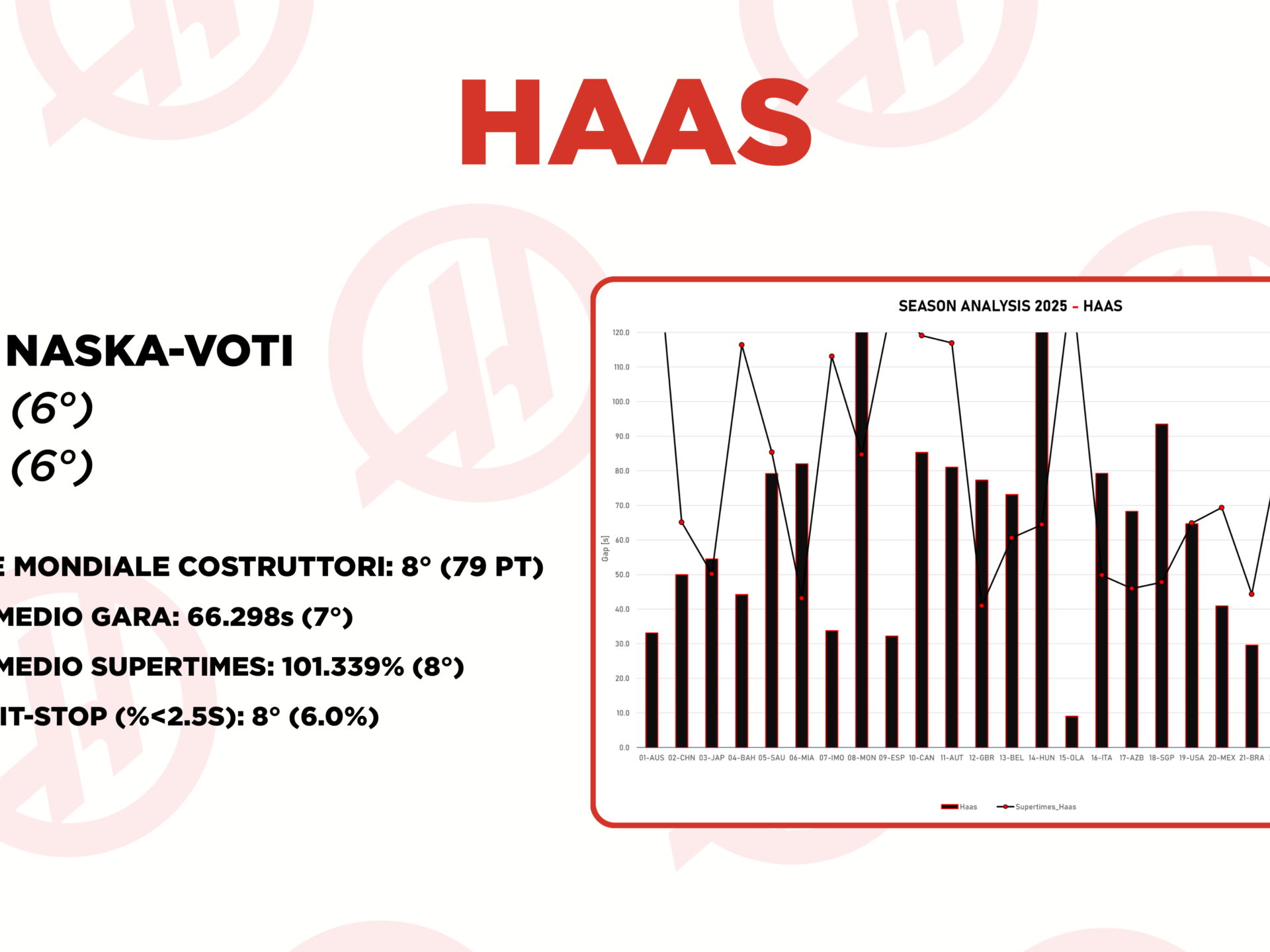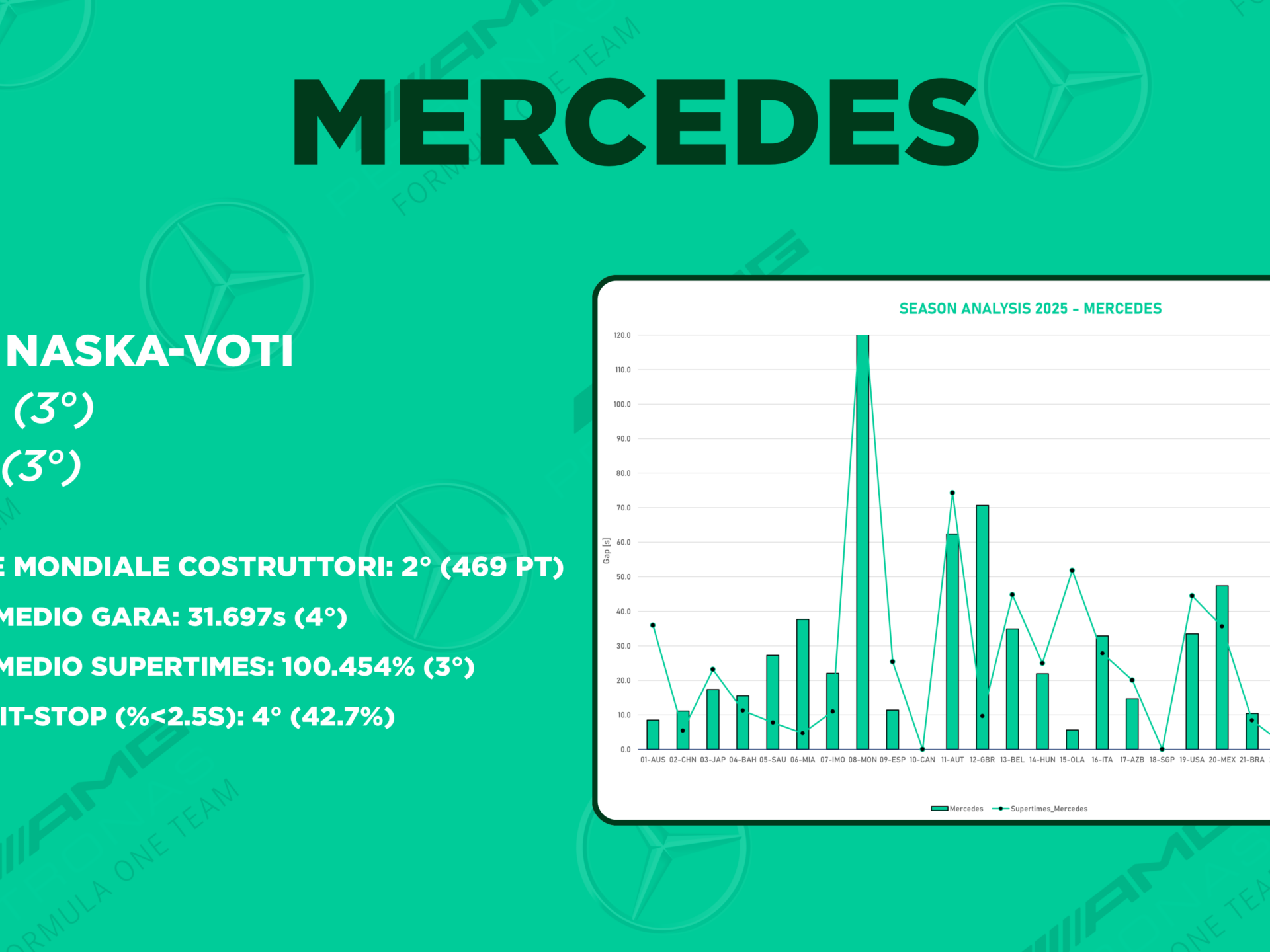 La SF-25 è stata disastrosa , con un valore medio dei Supertimes nettamente peggiore rispetto al 2024. A livello di squadra, si salvano i pit-stop, con una vittoria nel ranking schiacciante, cinque valori su cinque nei quali i meccanici sono stati i migliori. E in gara il distacco medio è migliore rispetto a Mercedes.