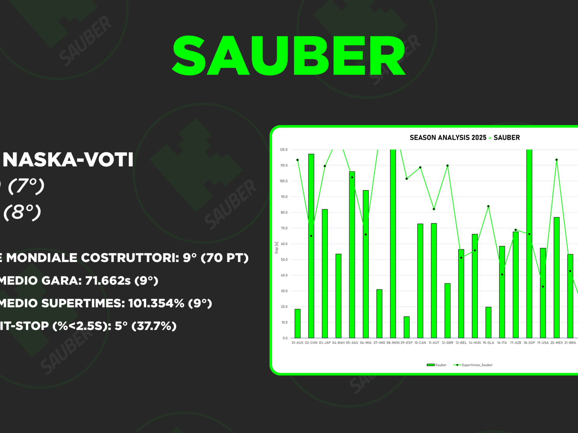 La stagione della Sauber ha vissuto alcuni picchi altissimi, come il podio di Hülkenberg a Silverstone o qualche Top10 di Bortoleto, ma è stata leggermente deludente. Certo, è andata meglio di quanto previsto dopo i test, ma alla fine, riguardando i dati, nulla di troppo esaltante.