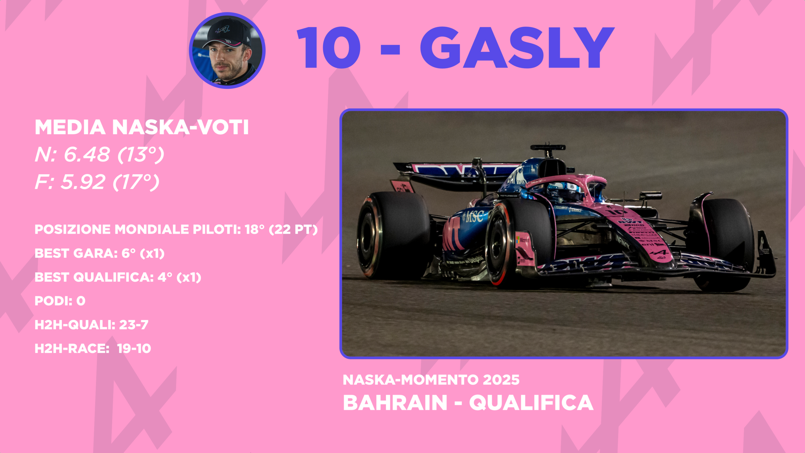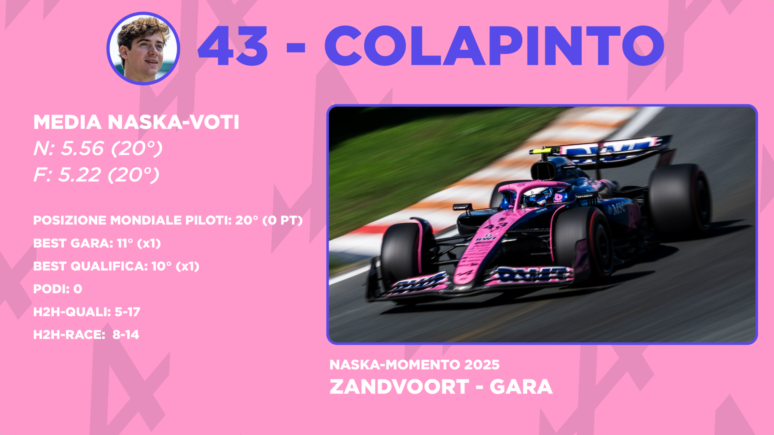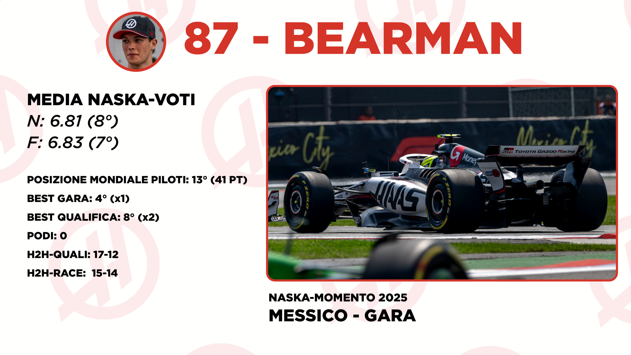 Per Ocon vale il discorso inverso rispetto a Bortoleto. Ha fatto talmente tanta fatica dopo l’estate, soprattutto nel confronto con Bearman, che me l’aspettavo più in basso nella media dei Naska-Voti. Invece, soprattutto grazie alla prima parte di stagione, ha messo tanto fieno in cascina. Preoccupante il non trovarsi con vetture nervose come piacciono a Ollie, perché di solito le vetture puntate sono più veloci; l’anno prossimo dovrà fare uno scatto se non vuole rischiare nel mercato piloti.