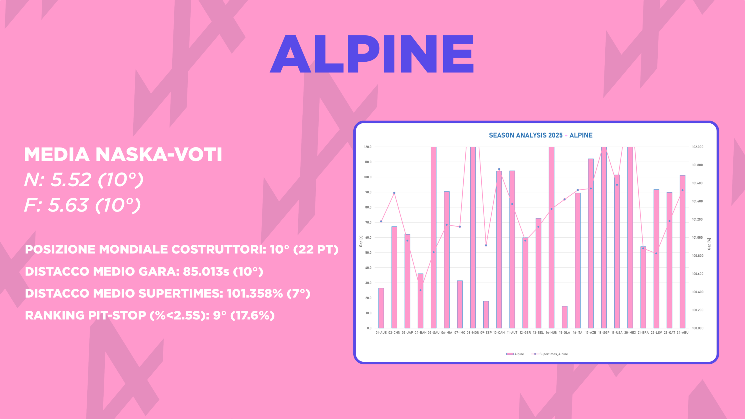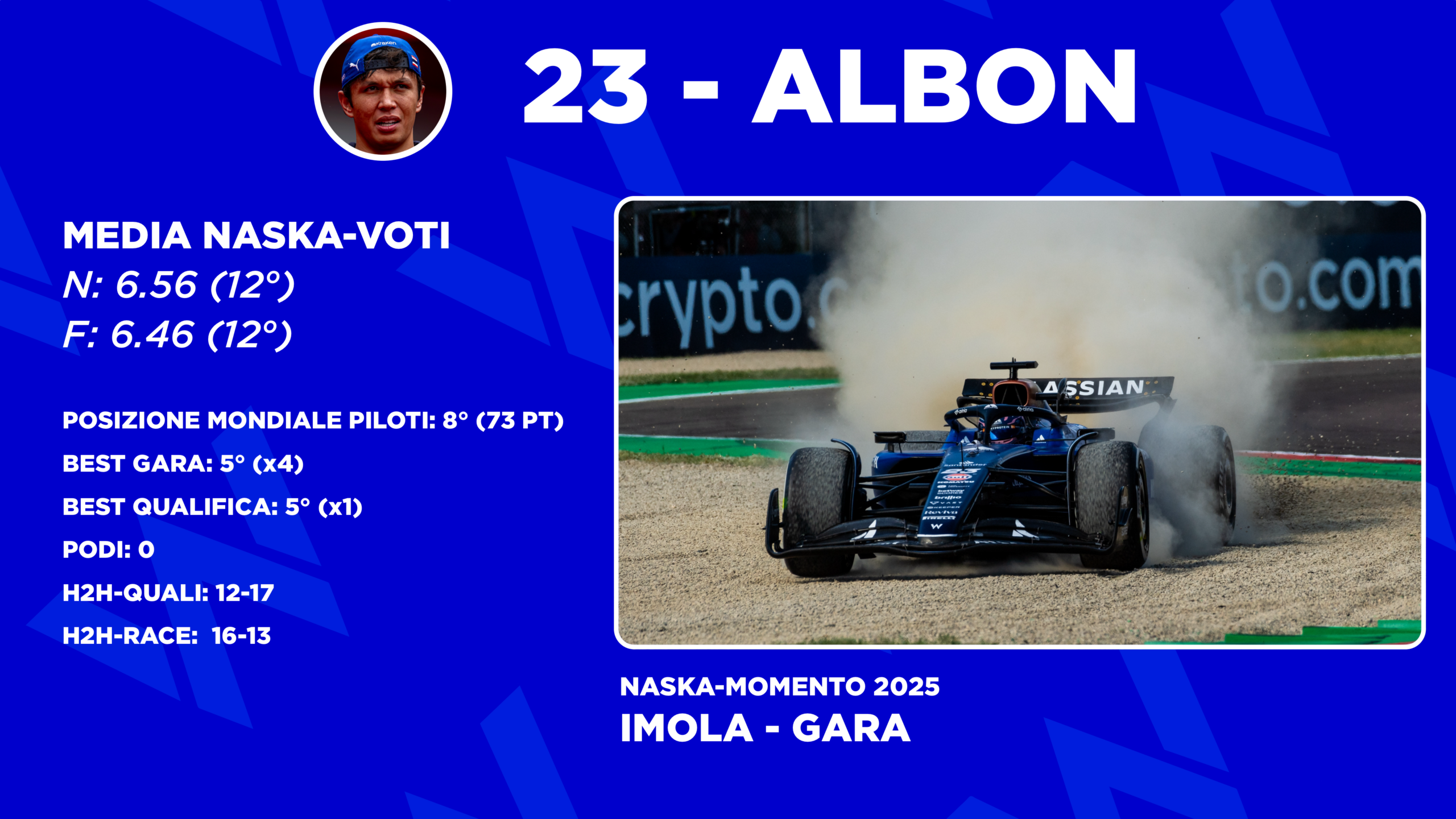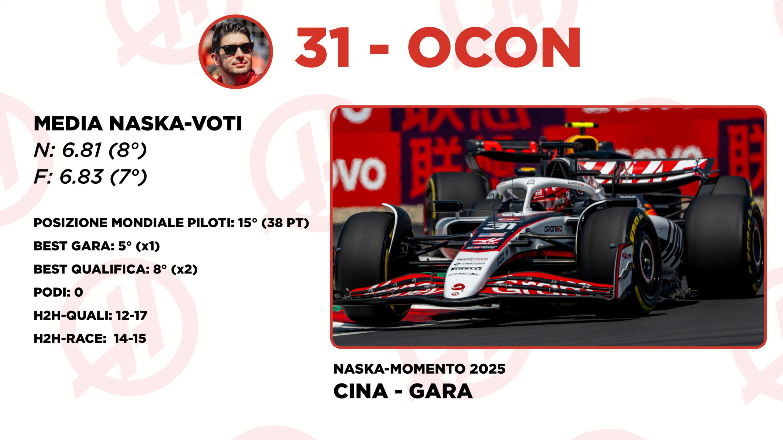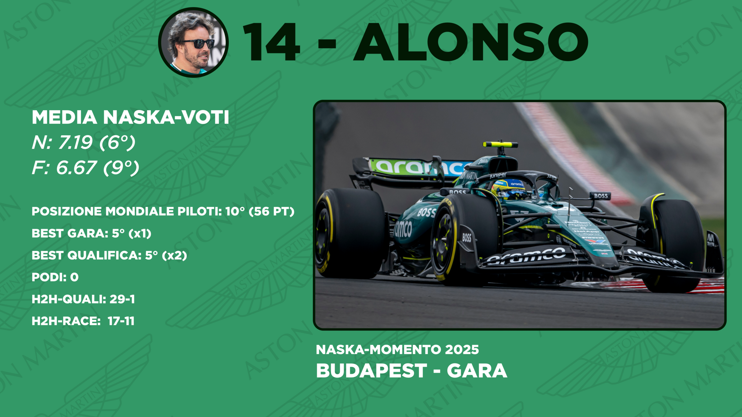 Per Ocon vale il discorso inverso rispetto a Bortoleto. Ha fatto talmente tanta fatica dopo l’estate, soprattutto nel confronto con Bearman, che me l’aspettavo più in basso nella media dei Naska-Voti. Invece, soprattutto grazie alla prima parte di stagione, ha messo tanto fieno in cascina. Preoccupante il non trovarsi con vetture nervose come piacciono a Ollie, perché di solito le vetture puntate sono più veloci; l’anno prossimo dovrà fare uno scatto se non vuole rischiare nel mercato piloti.