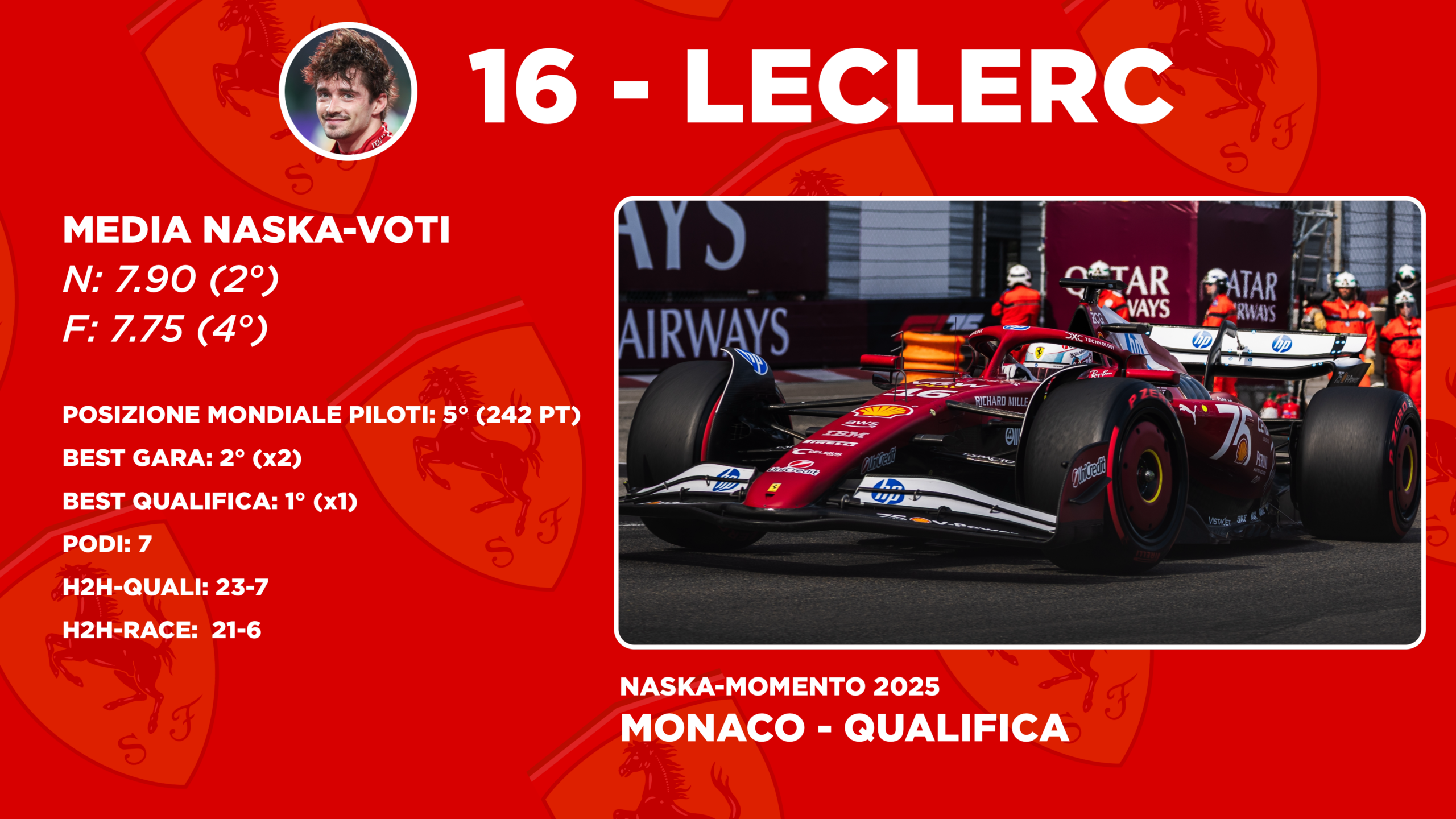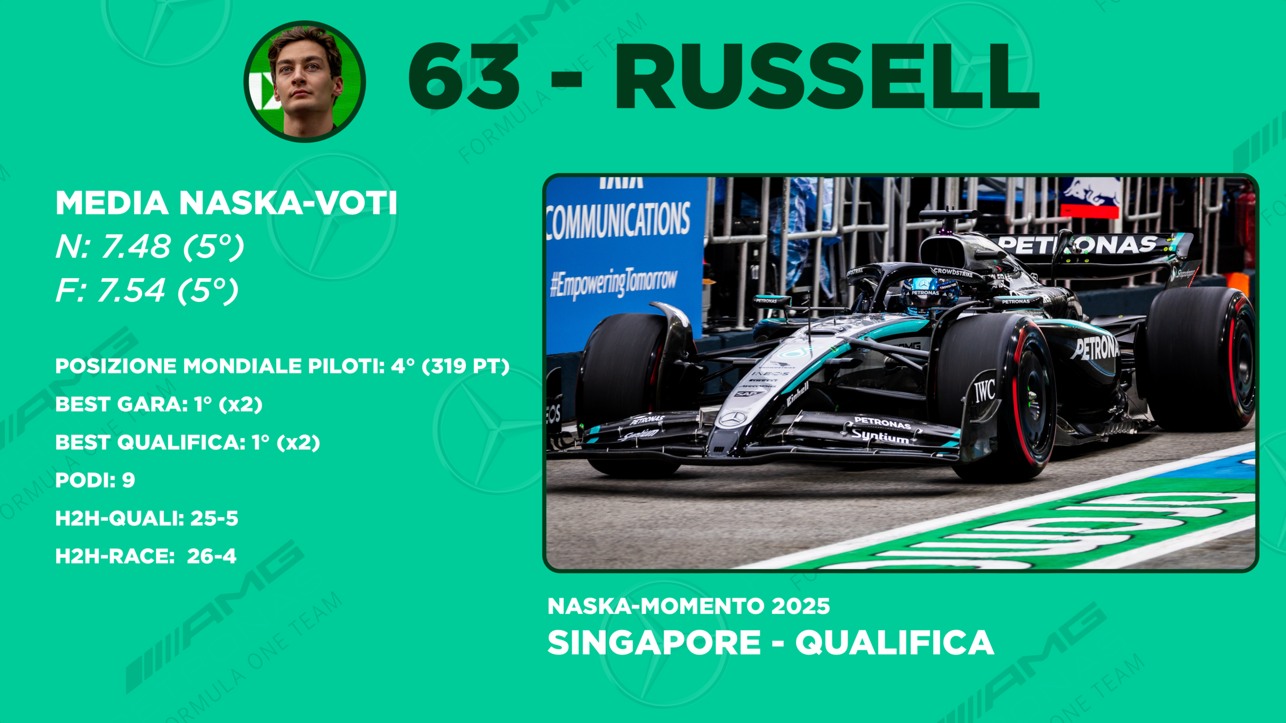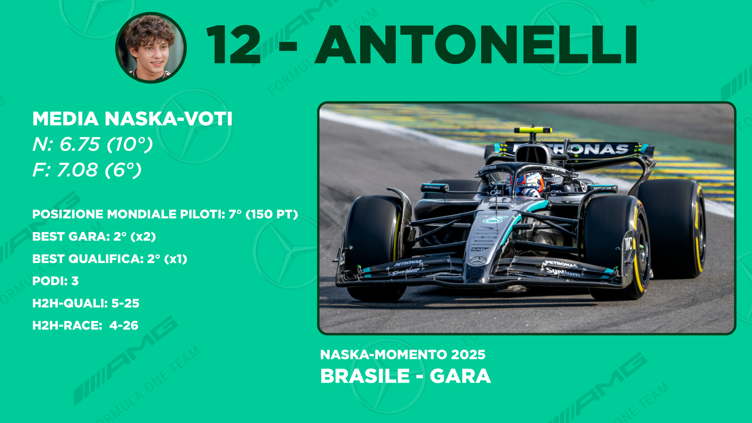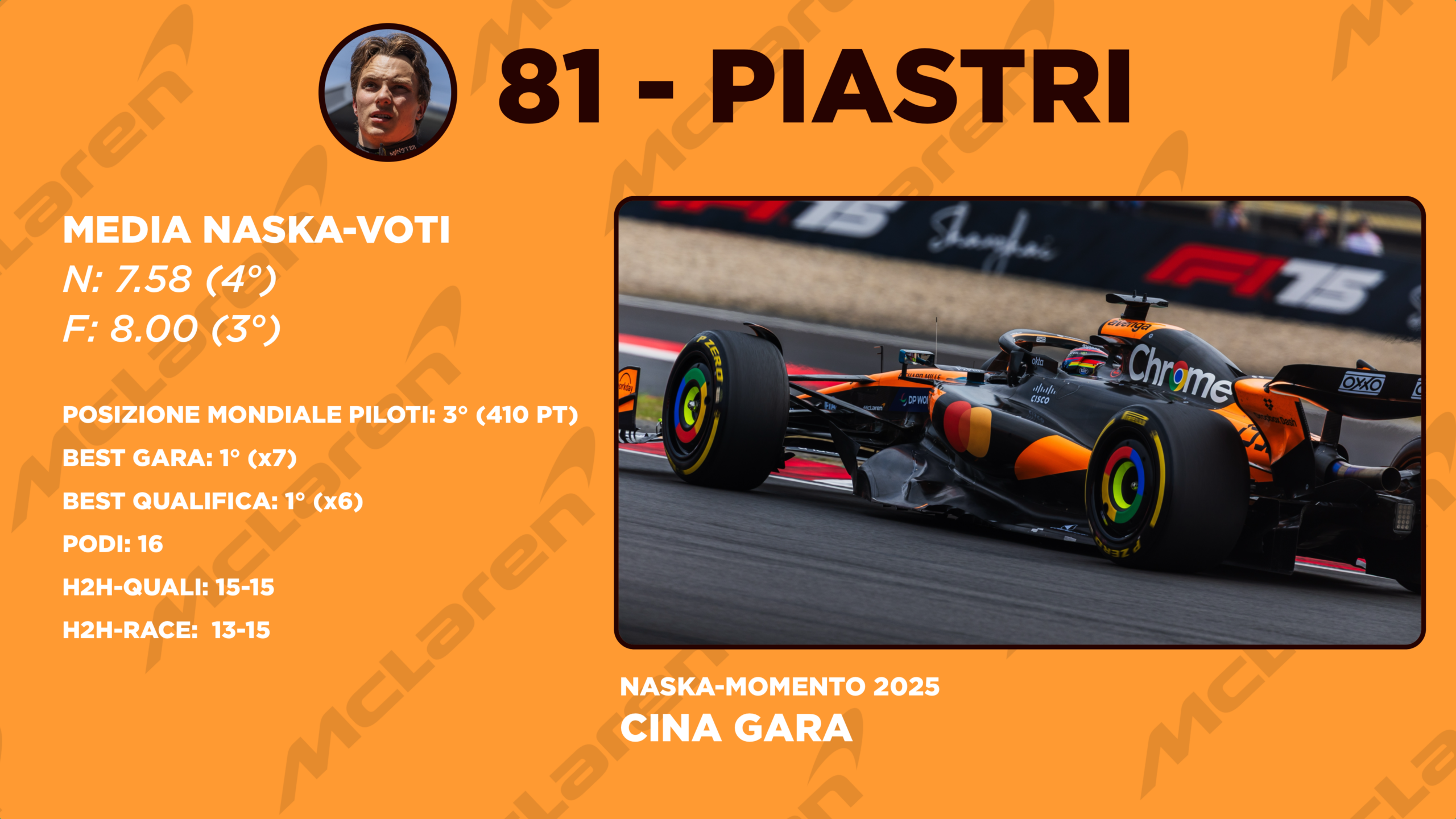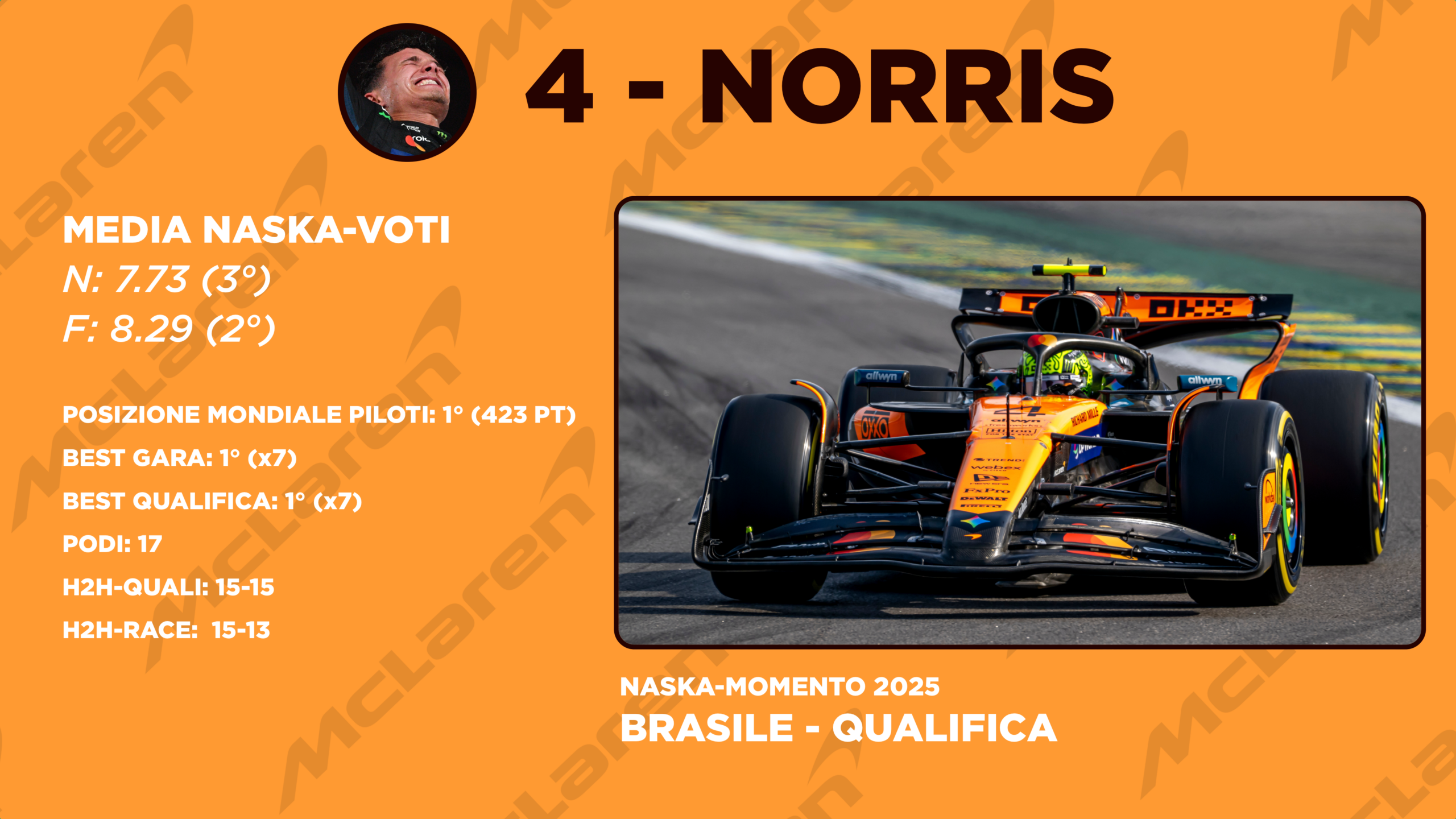 A metà stagione, Piastri aveva una media dei Naska-Voti superiore a 8 e sembrava destinato al titolo Mondiale. Paga carissimo il periodaccio che va da Baku a Las Vegas. Rispetto a Norris, ha retto molto bene in qualifica mentre ha faticato di più in gara. Non sembrava fosse così all’inizio dell’anno, dato che su pista come la Cina e Barcellona, dove nel 2024 aveva faticato, si è mostrato imprendibile. Per questo, credo la testa abbia giocato un ruolo fondamentale tra Monza e Singapore, e da lì le difficoltà con le gomme morbide e i tracciati scivolosi hanno avuto un effetto ancora più grande. Per voi è al 3° posto.