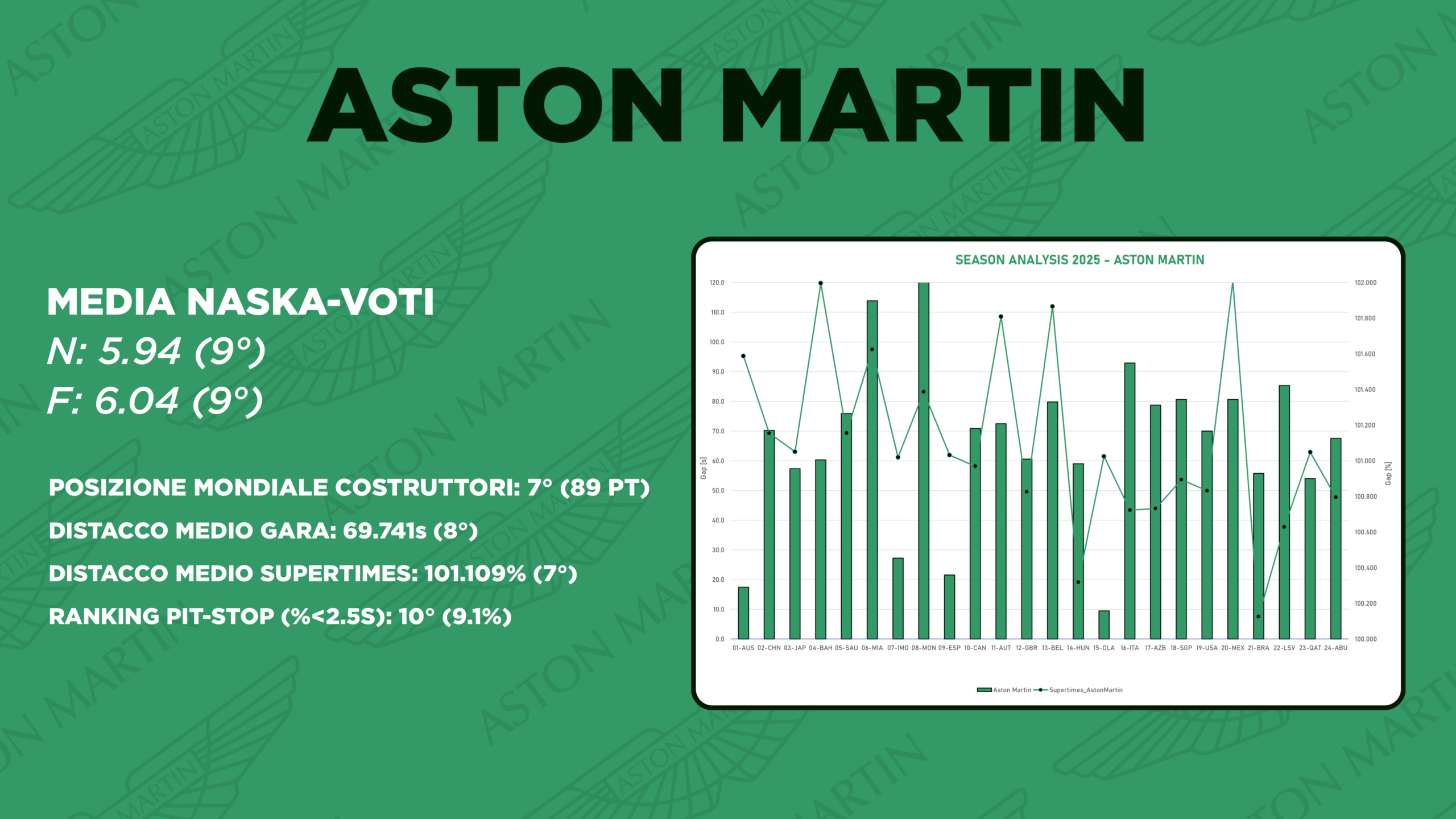 Tremendo il dato dei pit-stop, con l’ultima posizione nel ranking e nemmeno il 10% delle soste sotto i 2.5s. Quindi, una stagione deludente rispetto alle attese e alla disponibilità di una squadra come l’Aston Martin, che nel 2023 arrivava spesso sul podio.
