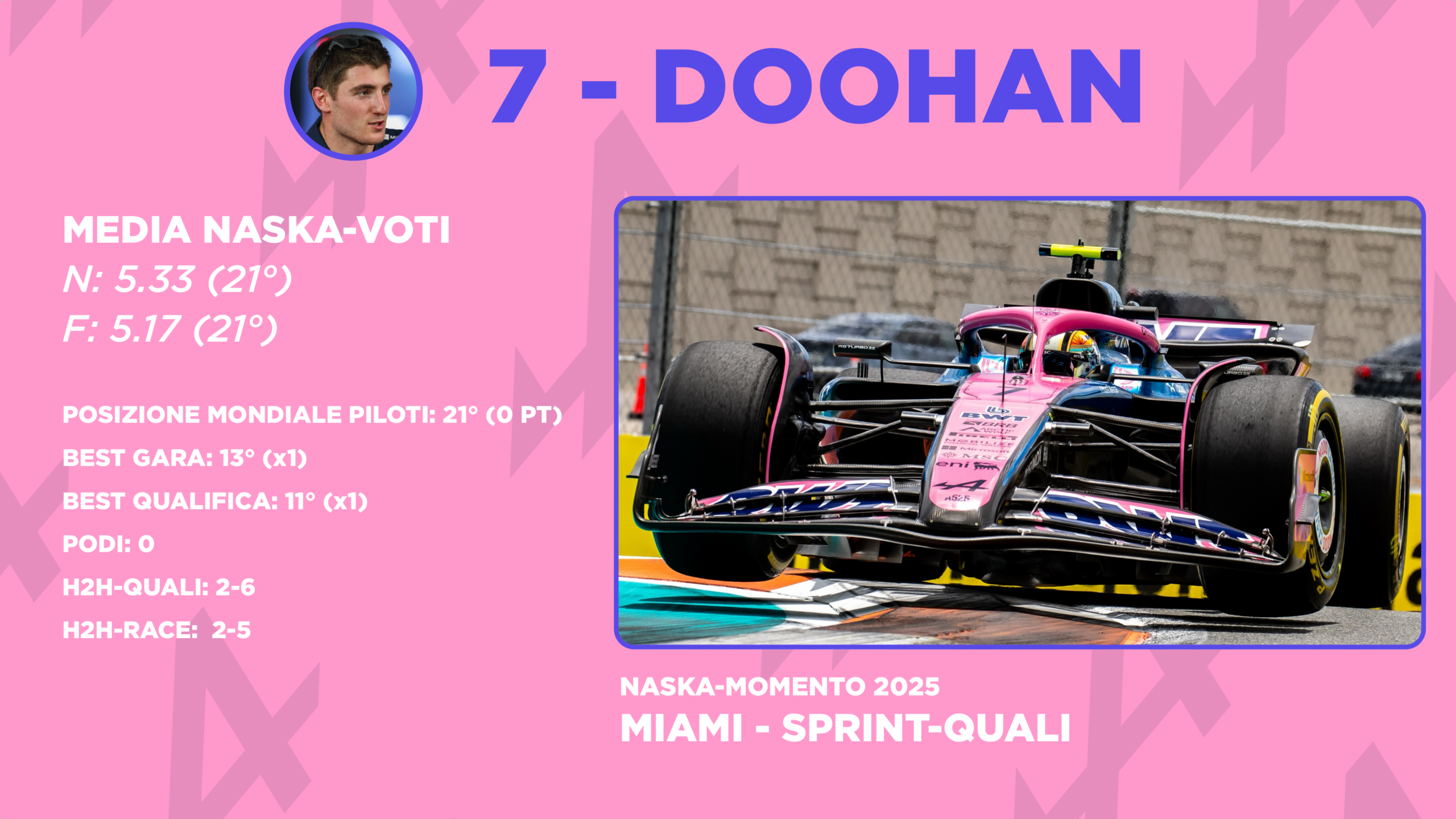 Il povero Jack Doohan è in fondo alla classifica. L’Alpine l’aveva promosso a fine 2024 senza che ci fosse troppa convinzione, e infatti è durato solamente quattro gare. Peccato, da un certo punto di vista perché, dopo i botti di Melbourne e Suzuka, stava migliorando. Non a caso, Miami è stato il weekend più convincente. All’ultimo posto sia per me, che per voi.