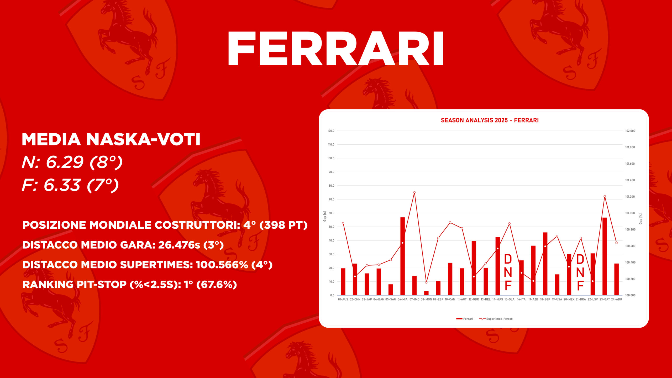La SF-25 è stata disastrosa , con un valore medio dei Supertimes nettamente peggiore rispetto al 2024. A livello di squadra, si salvano i pit-stop, con una vittoria nel ranking schiacciante, cinque valori su cinque nei quali i meccanici sono stati i migliori. E in gara il distacco medio è migliore rispetto a Mercedes.