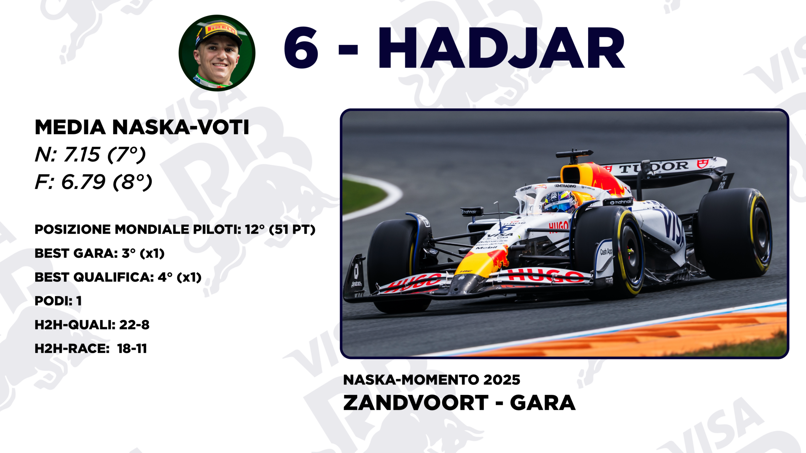 Il miglior rookie della stagione si prende il 7° posto per me, primo pilota con una media superiore al 7, voi invece l’avete messo un gradino sotto a Bearman. Ve ne ho già parlato nel Naskassunto, qui voglio sottolineare il ritmo davvero incredibile di Hadjar in qualifica. È stato una presenza più o meno fissa in Q3, aiutato da una VCARB facile da guidare, e forse alla fine avrebbe voluto raccogliere qualche punto in più. Bellissima corsa a Zandvoort e passaggio in Red Bull molto meritato: nel 2025, ha mostrato di avere la grinta che serve di fianco a Max.