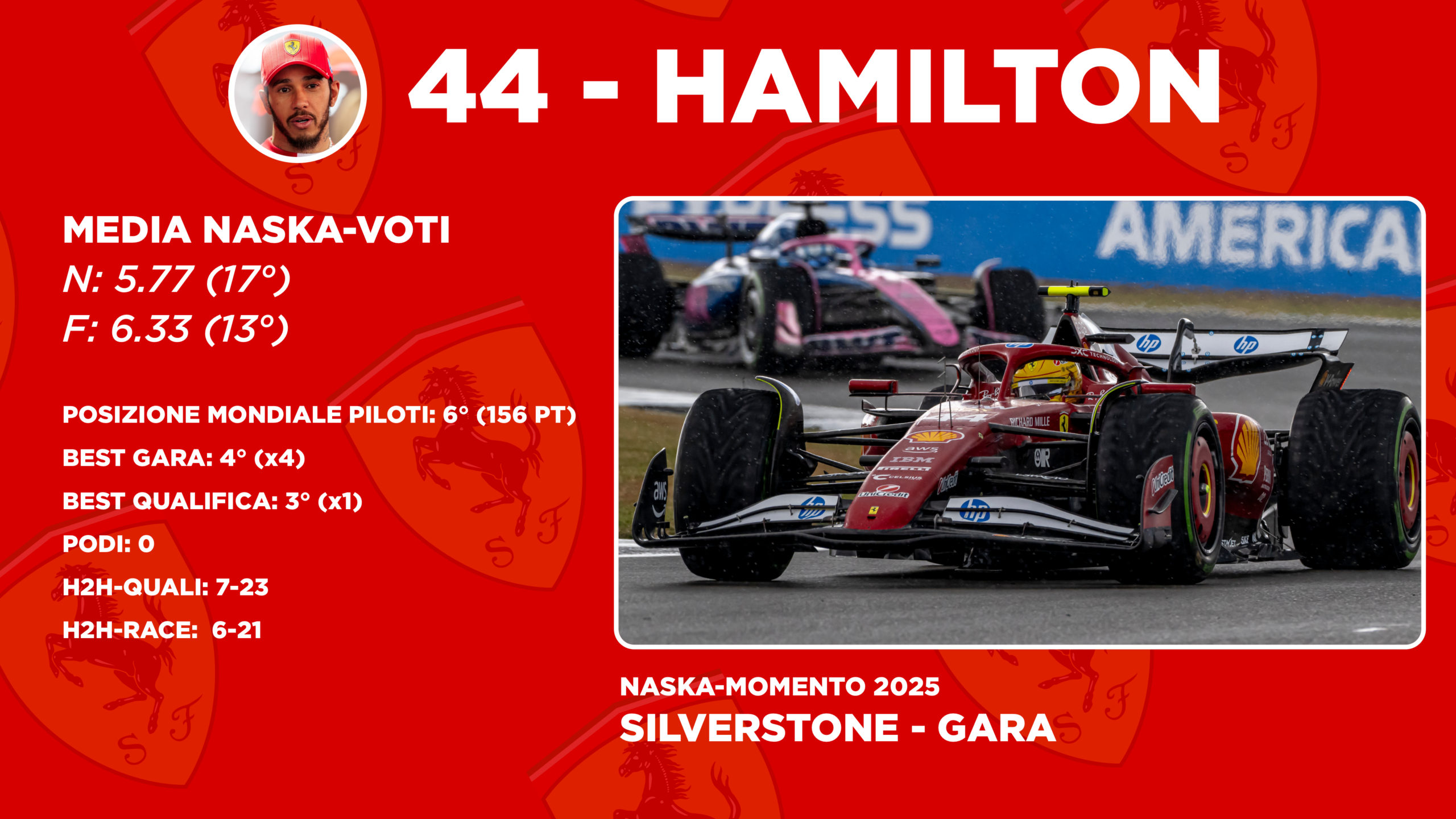 Ed ecco qui la grande sorpresa di questo pagellone, per quanto anche per voi Lewis Hamilton sia fuori dalla Top Ten. Voi avete ritenuto la sua stagione con un 6 molto convinto di media, è addirittura 13° nella vostra classifica, per il 2025 di Lewis è stato insufficiente. Qualche lampo, come Silverstone o la parte Sprint del weekend cinese. Per il resto, un sacco di difficoltà e un confronto pesantissimo con Leclerc, soprattutto in gara. Pensate che, Sprint escluse, sull’asciutto gli è rimasto davanti solo a Baku, per il mancato swap, e a Imola, grazie a una Safety fortunata. Ahia ahia.
