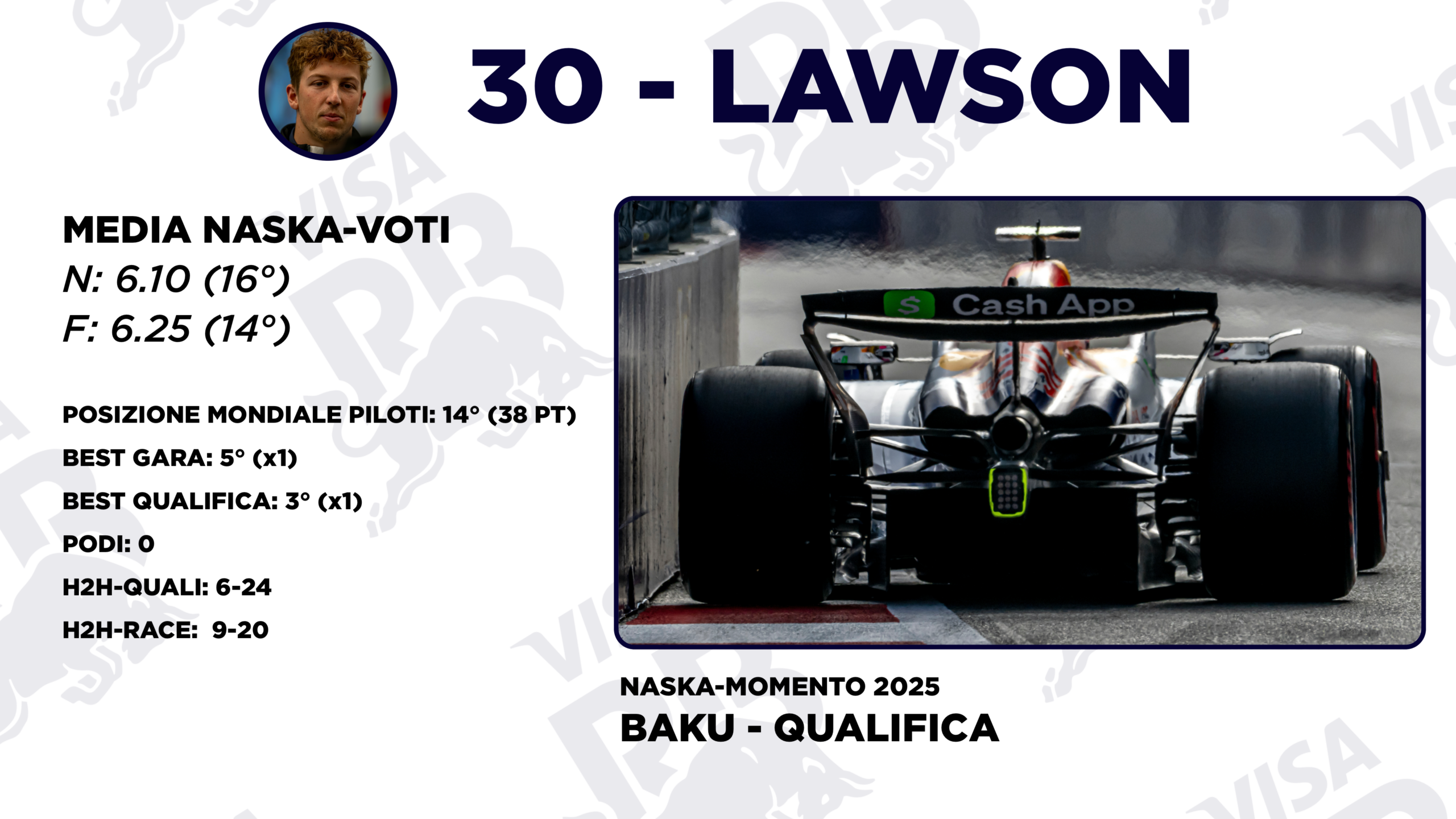 Al 16° posto troviamo Liam Lawson, primo dei piloti con una media sufficiente. Inizio di stagione difficilissimo, dopo due gare l’allontanamento dalla Red Bull, e poi ci è voluto un sacco perché si riprendesse. Ma, pian piano, i risultati sono arrivati, e alla fine ha chiuso non troppo distante in classifica da Hadjar e l e sue soddisfazioni se l’è tolte. La migliore, Baku: gran weekend, che forse gli è valso da solo la conferma.