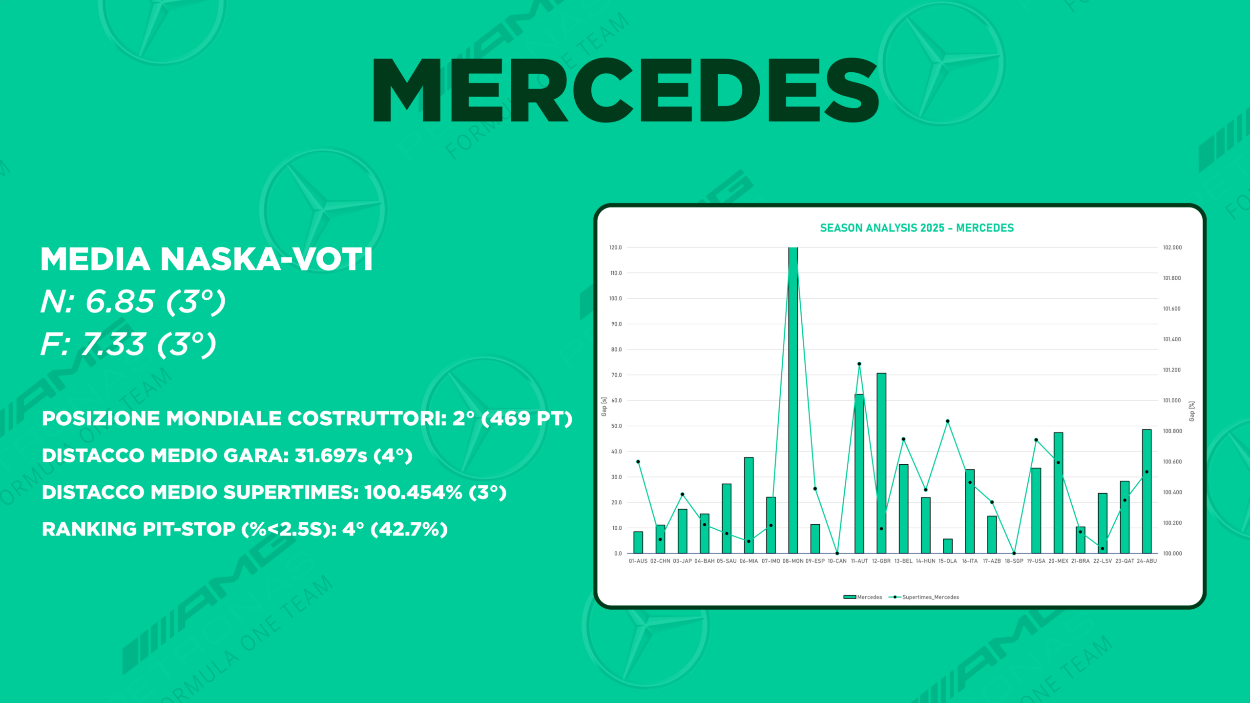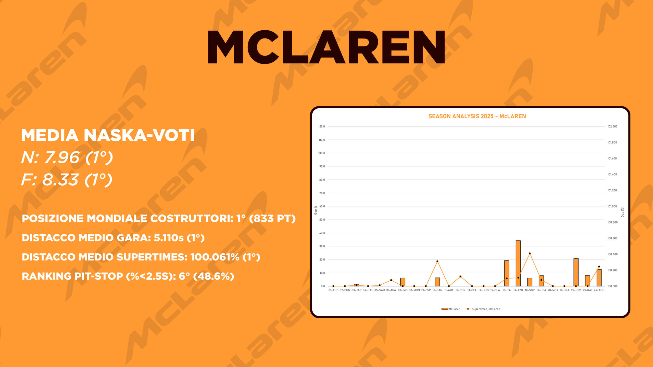 Per il resto, che gli vuoi dire? Migliori metriche in tutto, senza appello, e una monoposto perfetta. Hanno azzeccato perfettamente il concetto di vettura a effetto suolo, e nel 2025 lo hanno reso estremo, con un progetto dettagliatissimo, quasi perfetto in curva, e imprendibile appena il discorso si spostava sul consumo gomma. Che poi, è quello che determina i Gran Premi, e quindi i punti, e quindi i Mondiali.