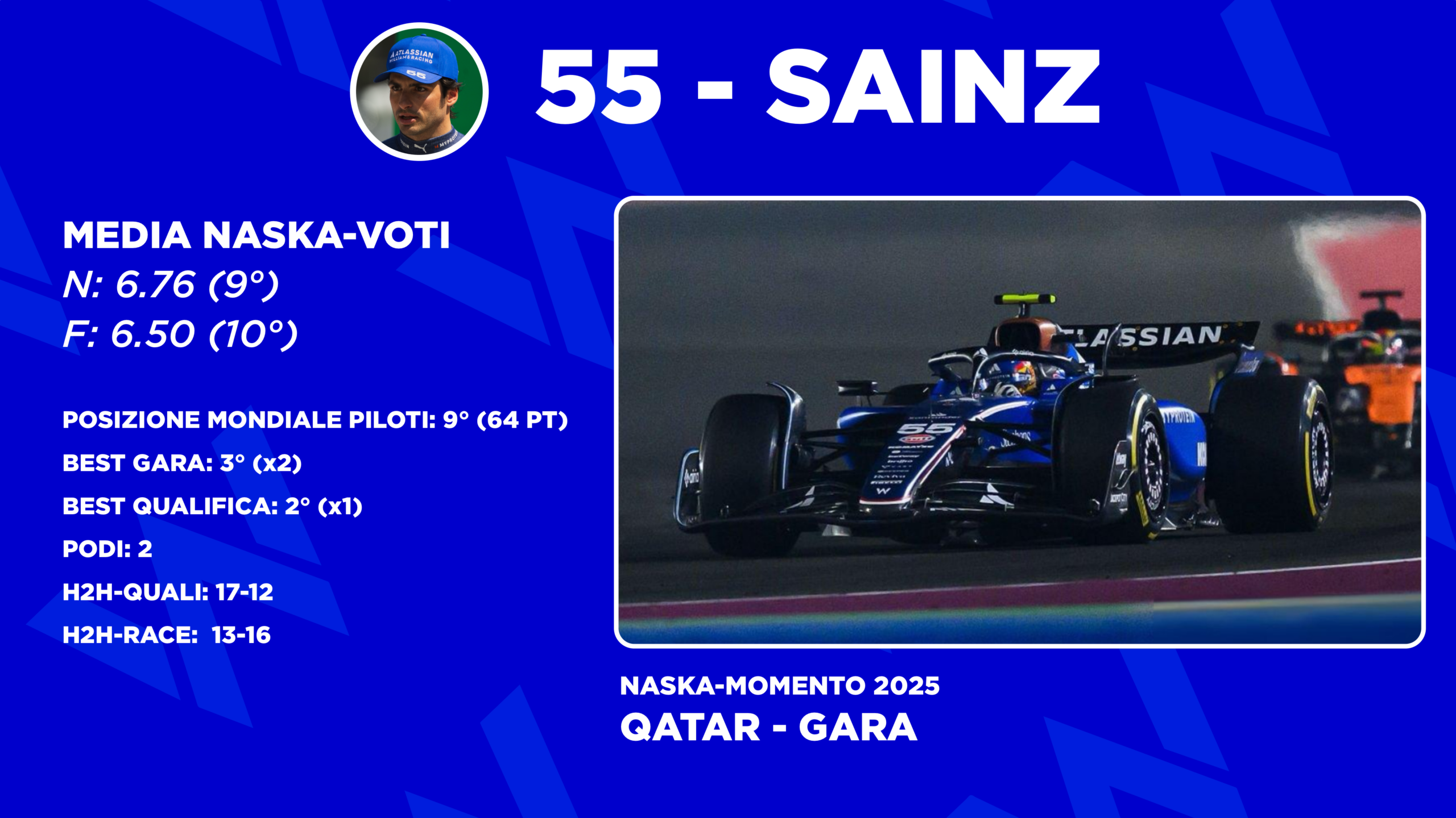 Ecco, per me questa è la più grande sorpresa se ritorno a cosa pensavo della stagione di Sainz diciamo a Monaco. Nelle prime gare, pur andando forte ogni tanto, Sainz proprio non riusciva ad ingranare. Fino a Monza, la velocità c’era, infatti alla fine in qualifica è andato più forte di Albon, ma i risultati no. Poi a Baku si è sbloccato ed è venuto fuori il pilota che mi aspettavo. La Williams è sua, per il 2026 vi dico di tenerlo davvero d’occhio, e ragazzi, il podio del Qatar è tra le prestazioni migliori di tutta la stagione.