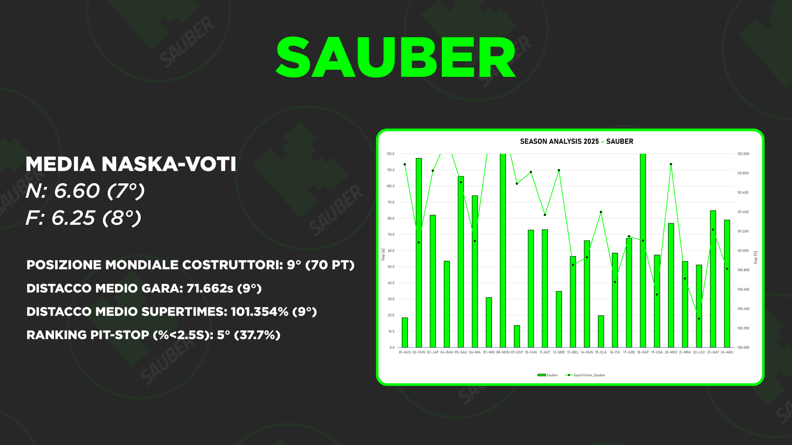 La stagione della Sauber ha vissuto alcuni picchi altissimi, come il podio di Hülkenberg a Silverstone o qualche Top10 di Bortoleto, ma è stata leggermente deludente. Certo, è andata meglio di quanto previsto dopo i test, ma alla fine, riguardando i dati, nulla di troppo esaltante.