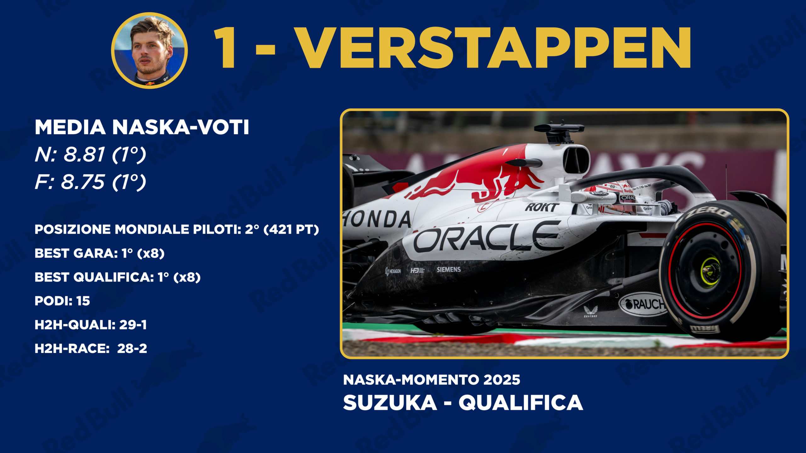 Avrei mai immaginato che Max Verstappen avrebbe chiuso senza vincere il Mondiale Piloti, ma con una media più alta rispetto al 2024? Assolutamente no. Qualcosa di incredibile, non credo rivedremo mai più una media dei Naska-Voti che si avvicina così tanto al 9. Max ha fatto più Pole Position di tutti, ha vinto più di tutti, e diciamoci la verità: gli sarebbe bastato concludere la corsa in Austria, dove aveva zero colpe nell’incidente con Antonelli, e il Mondiale sarebbe stato suo. Sì, lo so, il giochetto dei se non vale perché anche Norris ha perso tanti punti per responsabilità non sue, ma Verstappen avrebbe meritato un Mondiale che premiasse l’incredibile rimonta. Spettacolare il giro in Q3 a Suzuka, ma spettacolare tutta la stagione. Senza ombra di dubbio, il pilota migliore nel 2025 in F1.