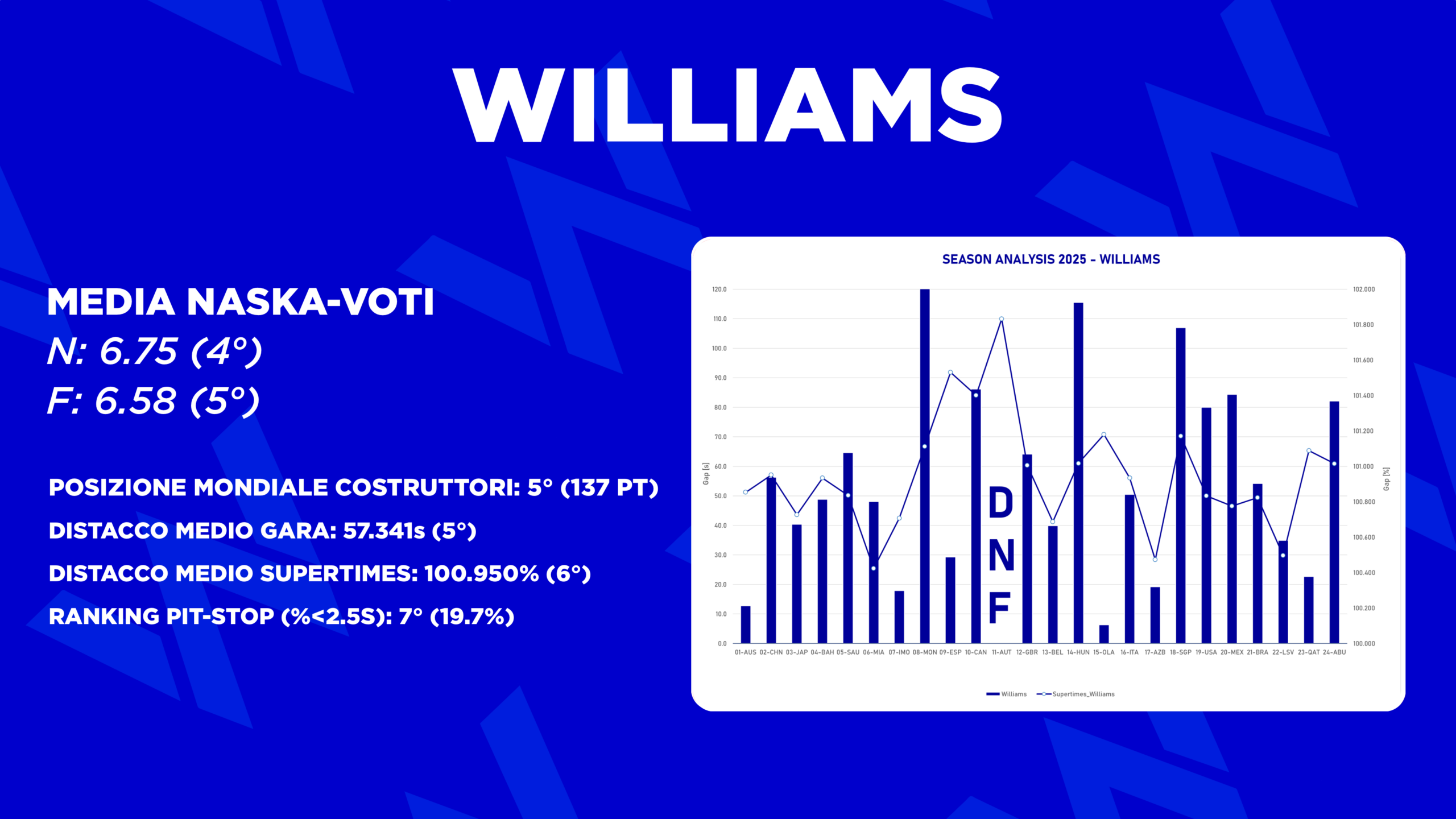 Stagione eccezionale per la Williams, per me sono addirittura quarti nella media dei Naska-Voti con un 6.75 che è un valore davvero ottimo.