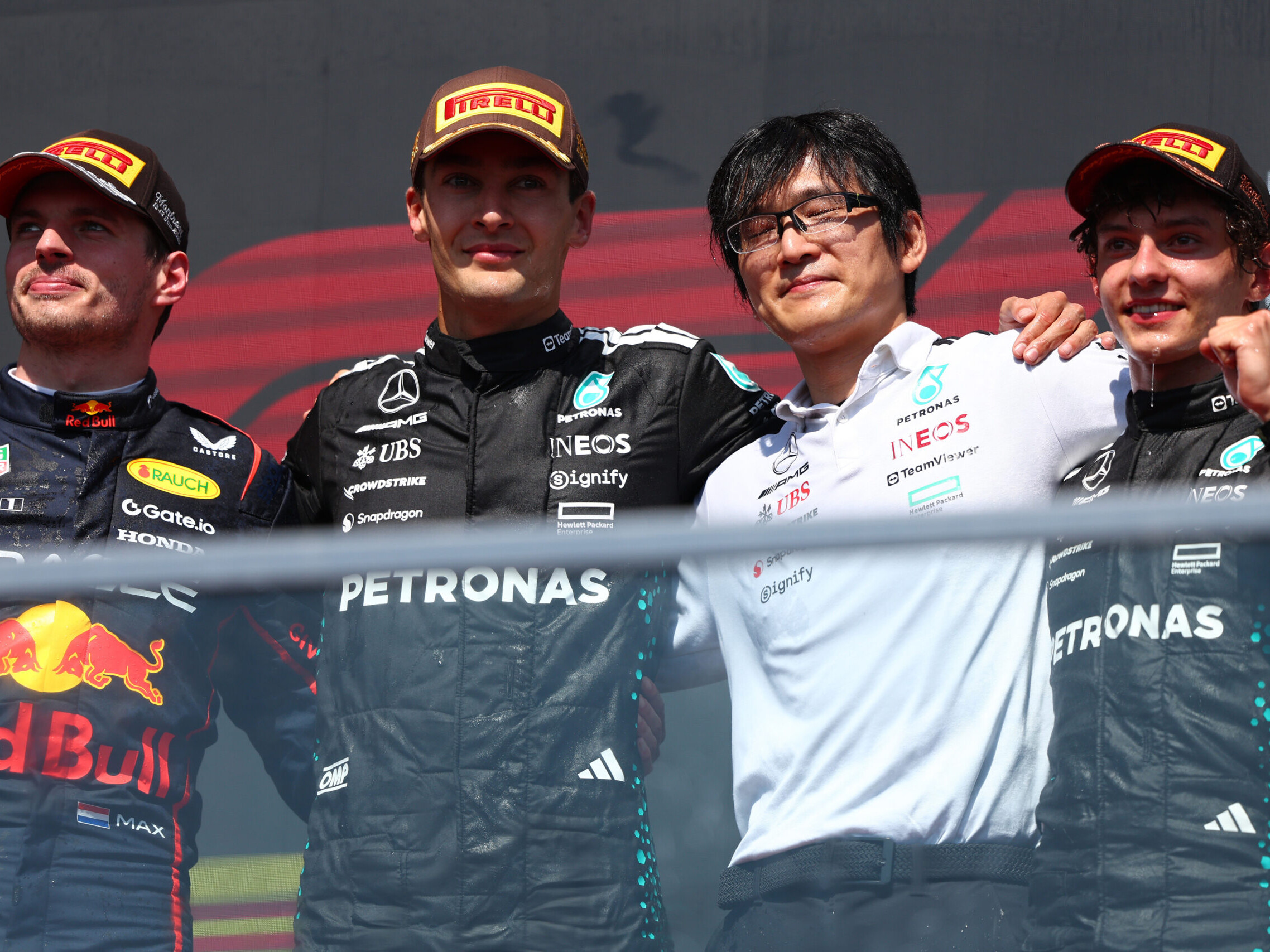 Vince Russell, con Verstappen 2°, Antonelli 3° al primo podio in carriera, poi Piastri, Leclerc, Hamilton, Alonso, Hülkenberg 8° ancora a punti e chiudono la Top Ten Ocon e Sainz, che hanno scelto la sosta singola per risalire il centro gruppo.