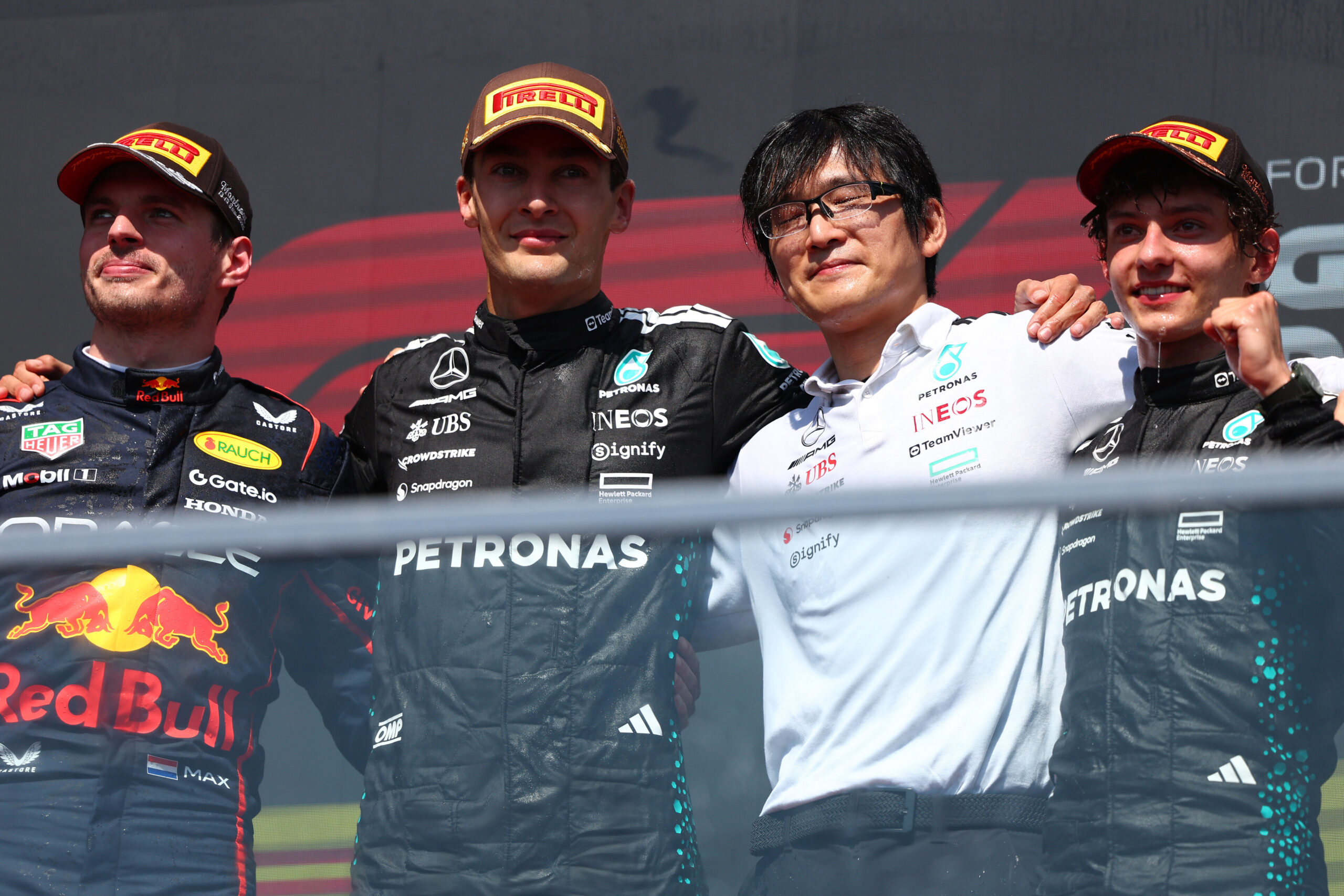 Vince Russell, con Verstappen 2°, Antonelli 3° al primo podio in carriera, poi Piastri, Leclerc, Hamilton, Alonso, Hülkenberg 8° ancora a punti e chiudono la Top Ten Ocon e Sainz, che hanno scelto la sosta singola per risalire il centro gruppo.