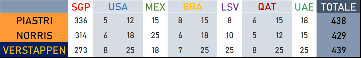 Rimane una situazione complicata. Max deve vincere sempre tranne che in Messico e nella Sprint in Brasile, dove arriva 2°. Norris deve faticare e Piastri fa un solo 2° posto, ad Abu Dhabi. McLaren non fa schifo ma, insomma, sarebbe un’impresa e comunque richiede che Mercedes e Ferrari… LOL… mettano i bastoni tra le ruote a McLaren. Soprattutto a Las Vegas.