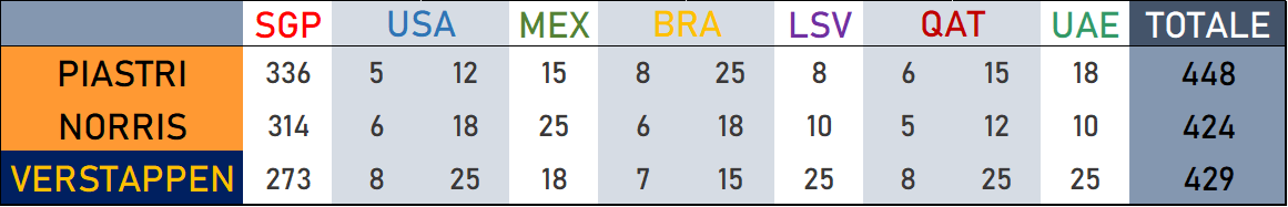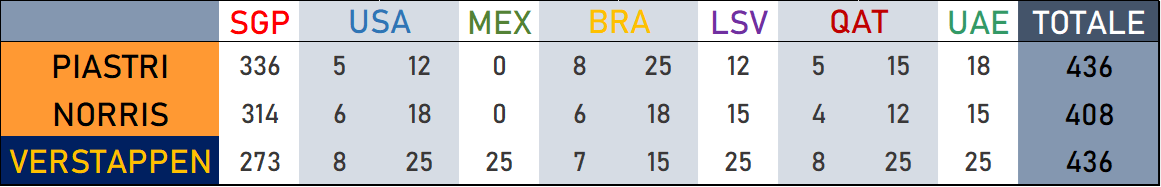 Immaginiamo che le McLaren si scontrino a Città del Messico, dove in partenza può succedere di tutto… nonostante un 25-0 su entrambi i papaya, Max perde lo stesso. Non gli basta vincere sempre tranne che nella Sprint in Brasile, dove arriva 2°, e nella gara sempre in Brasile, dove mi aspetto le McLaren imbattibili e allora fa 3°.