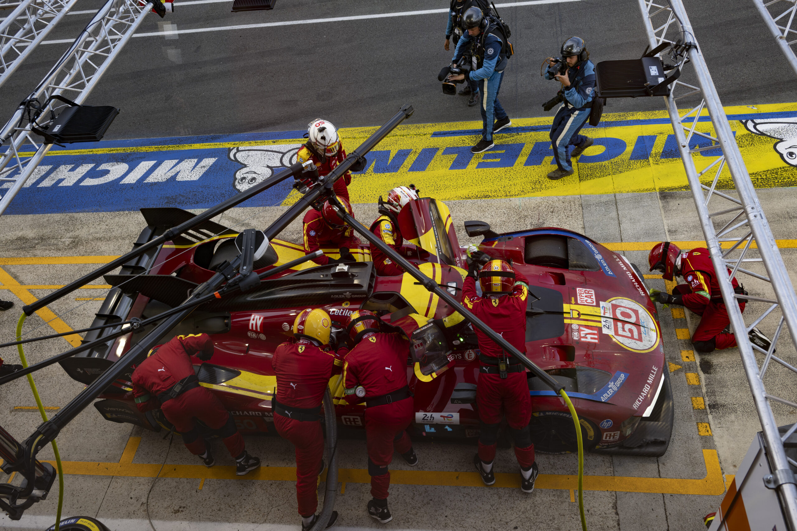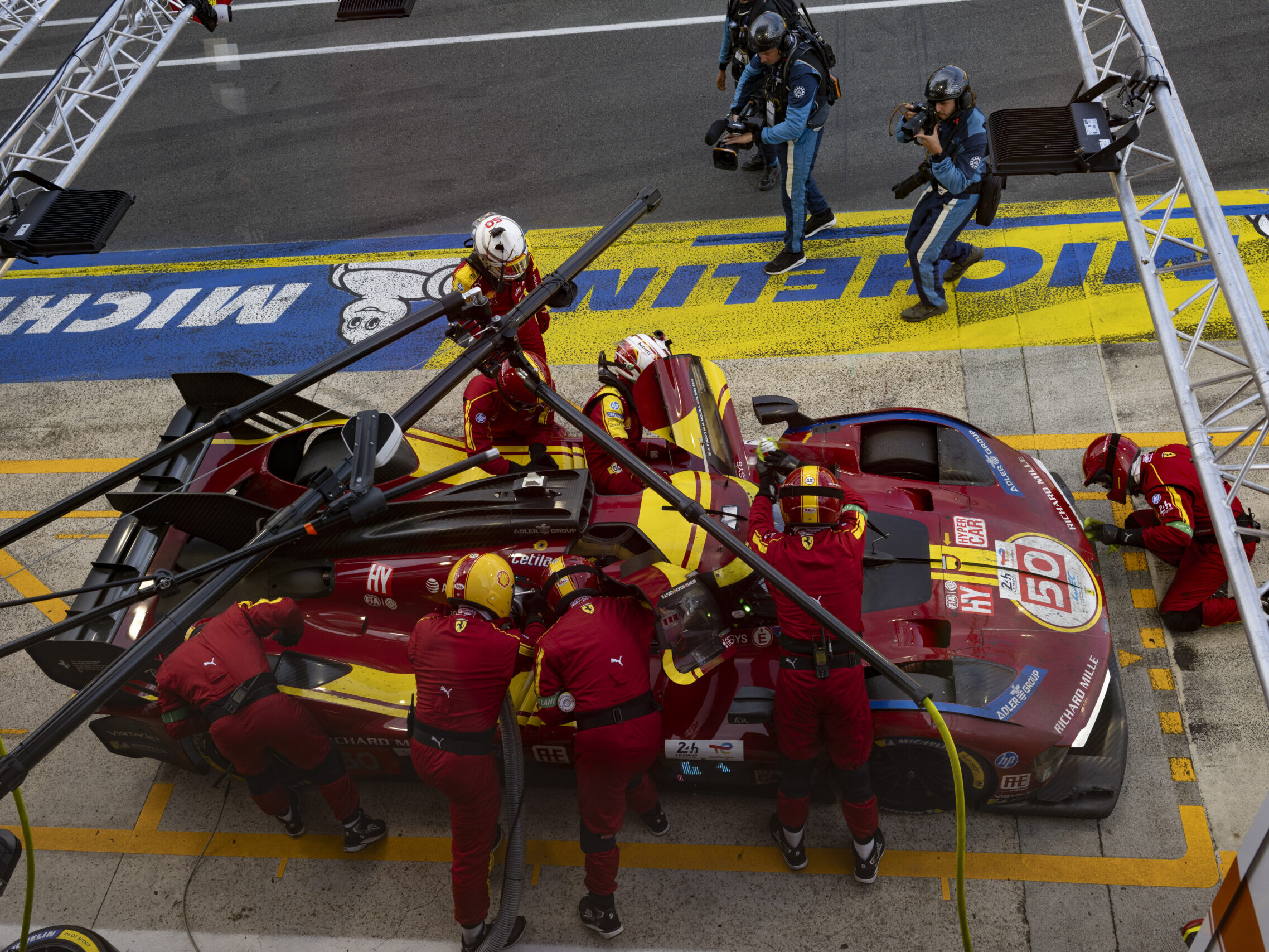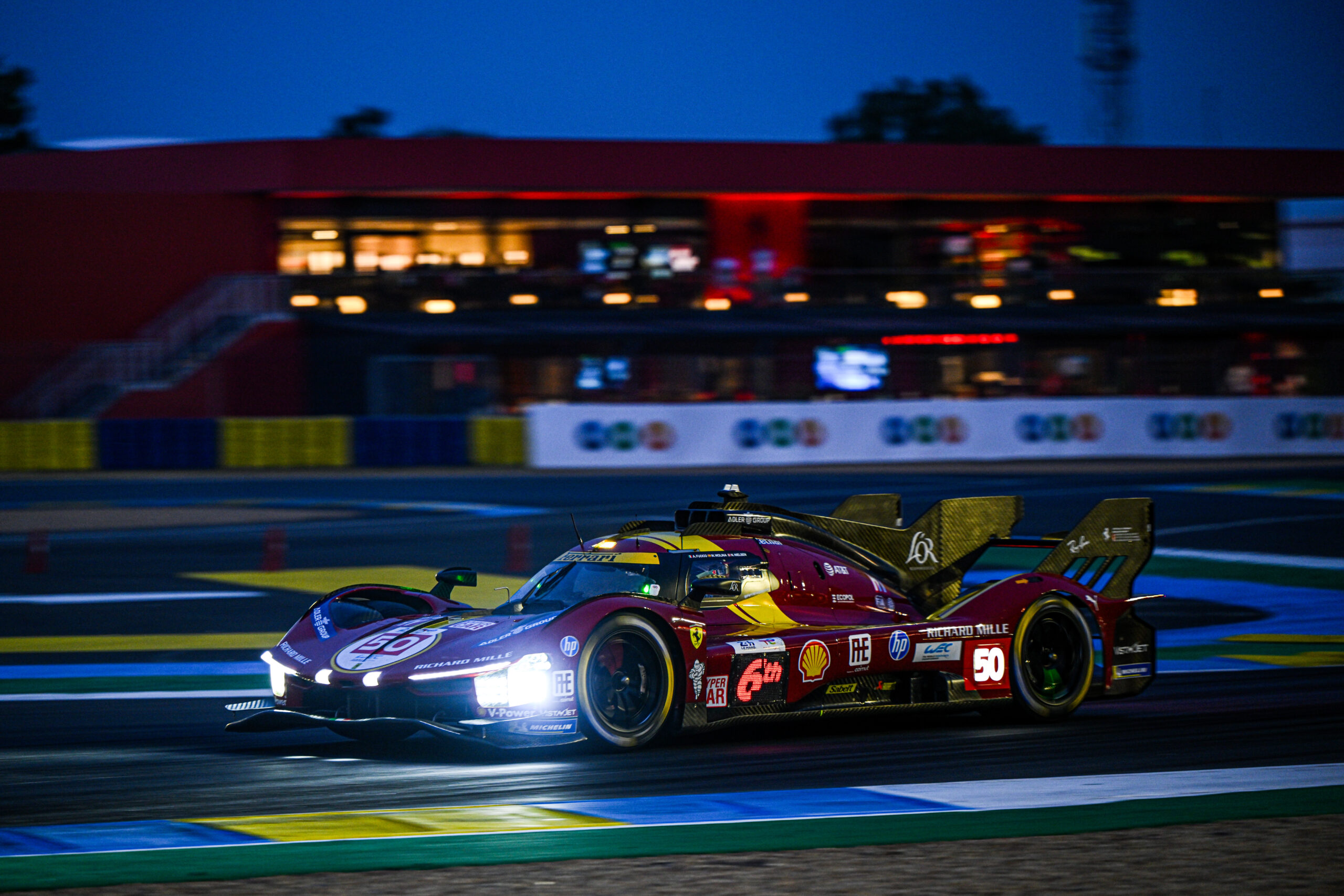 E ora deve resistere. Perché la Porsche #6 è diventata improvvisamente perfetta, la strategia gomme di casa Porsche ha messo Kevin Estre e Laurens Vanthoor in condizione di spingere come dannati. Ma soprattutto, le due Ferrari ufficiali, la #50 e la numero #51, iniziano ad accusare piccoli problemi. Non possono attaccare con il passo. Ci provano con la strategia ma non serve.