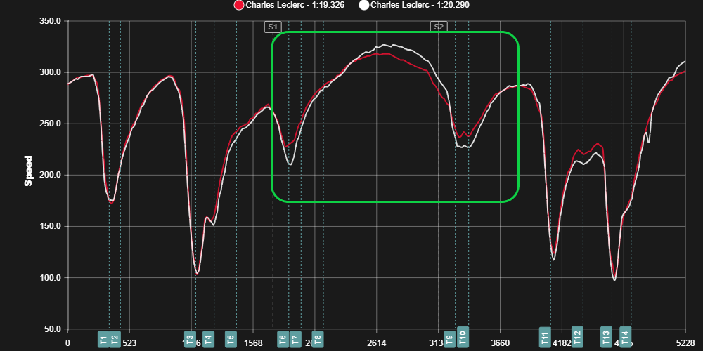La freccia arancione vi fa vedere che Leclerc continua ad essere molto meno veloce tra curva 10 e curva 11. La freccia verde, invece, mostra che nel passo gara la Ferrari si difendeva molto meglio nel rettilineo precedente. Quindi, in modalità meno estrema, la Power Unit Ferrari sembra reggere meglio.