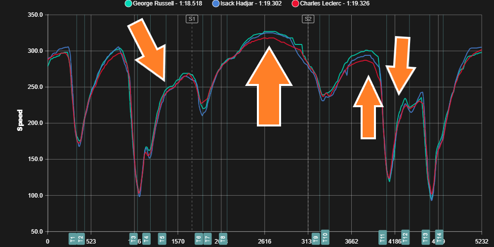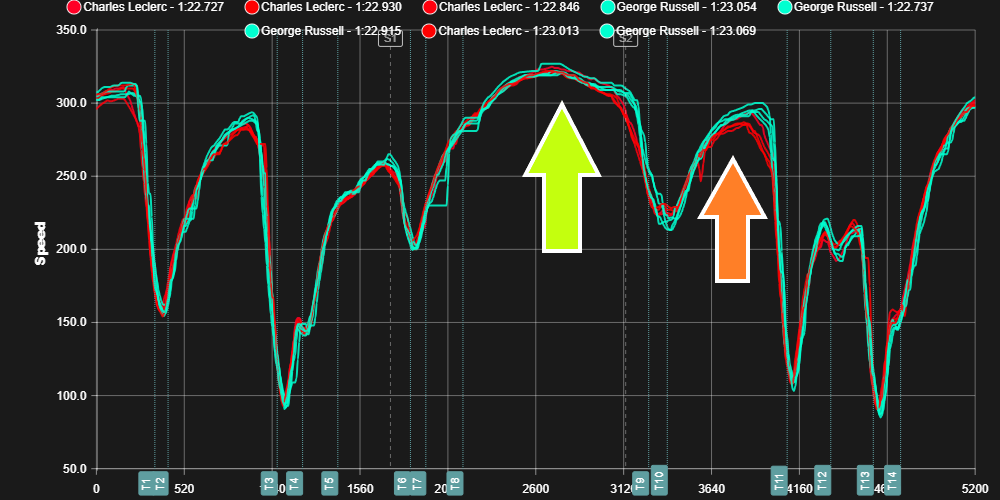 Primo grafico, il tracciato di velocità: guardate quanto vantaggio ha Russell! Tutti i tratti di piena potenza, indicati dalle frecce arancioni, lo avvantaggiano. La sua traccia è quella più alta, si vede bene.