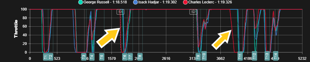 Questo è il tracciato degli acceleratori di Russell, Leclerc e Hadjar. Guardate quanto Lift & Coast deve fare Leclerc. Ve lo mostrano le frecce gialle. In qualifica, eh, in Q3, dove devi spingere al massimo, Charles alza il piede 150 metri prima in curva 11. Perché? Perché deve ricaricare. Russell, dei tre piloti, è sempre quello che alza il piede dopo, tranne forse in curva 1. Perché? Perché il suo Superclipping funziona benissimo. E questo paga sul cronometro.