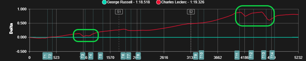 Per farvi capire ancora meglio quanto intendo, vi faccio vedere il tracciato del distacco durante il giro tra Russell e Leclerc: